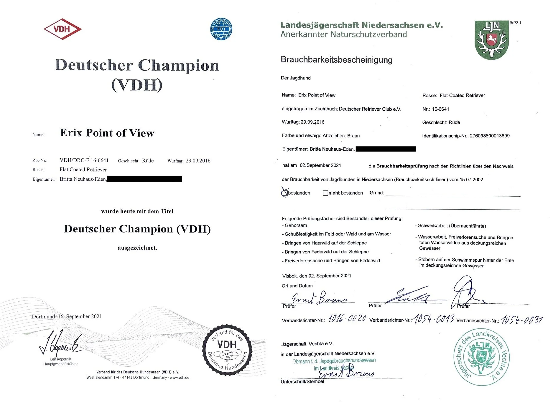 Last Month, Paule accomplished two great achievements. He passed a hunting exam called Jagdeignungsprüfung mit Schweißarbeit und lebender Ente (JEPs) which translates to hunting aptitude test including a blood track and a live duck. Additionally, he was granted the title German Champion from the VDH after gaining his final CAC at the German Winner Show in Gelsenkirchen. He now holds both German Champion titles.